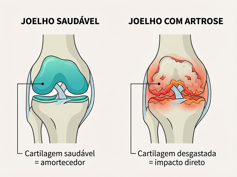 Com o tempo (e o uso), esse amortecedor vai se desgastando — seja por artrose, condromalácia, excesso de peso ou até pequenas lesões antigas.